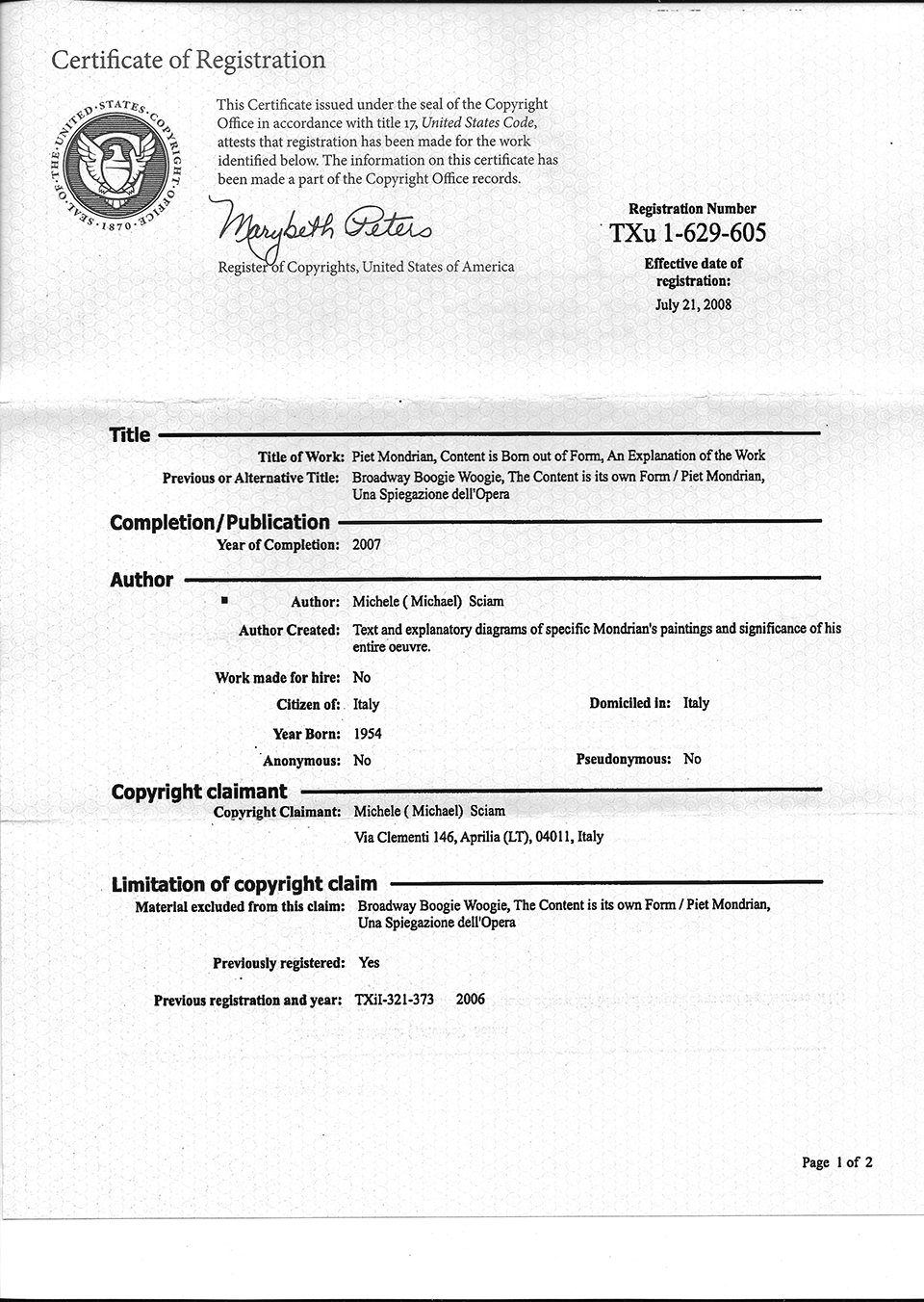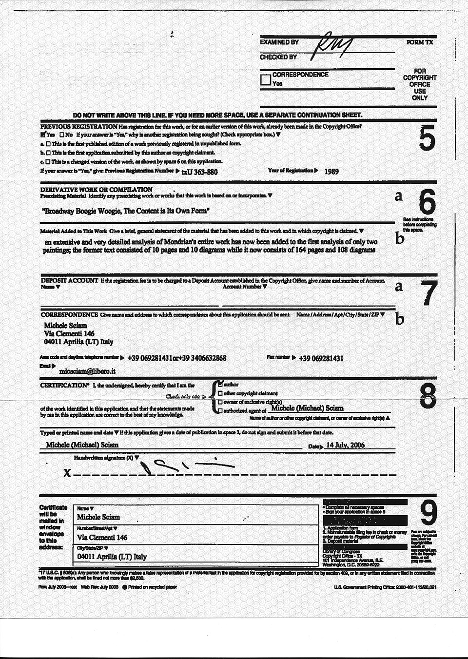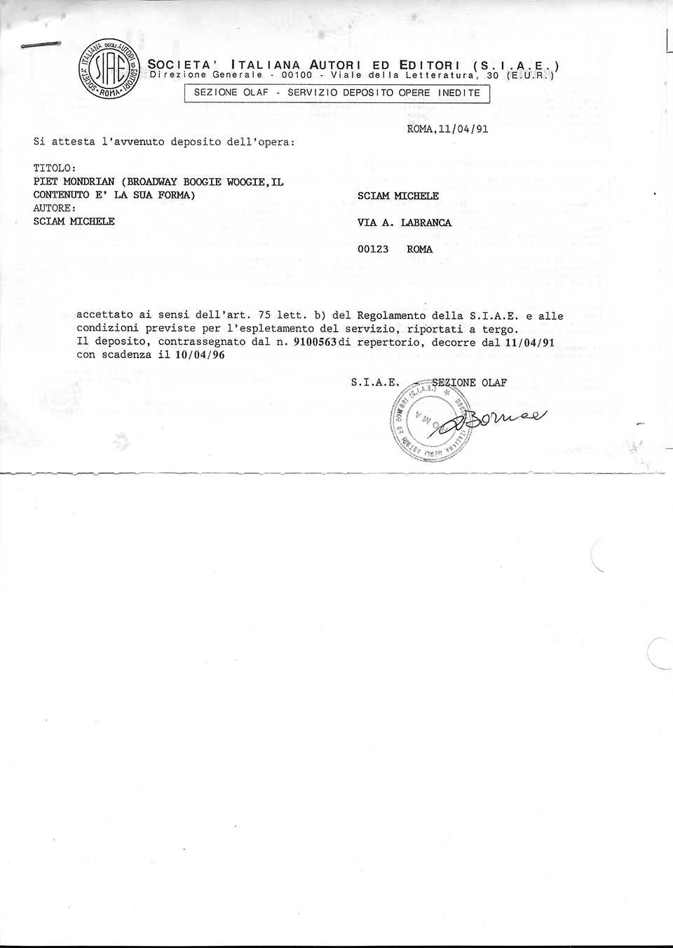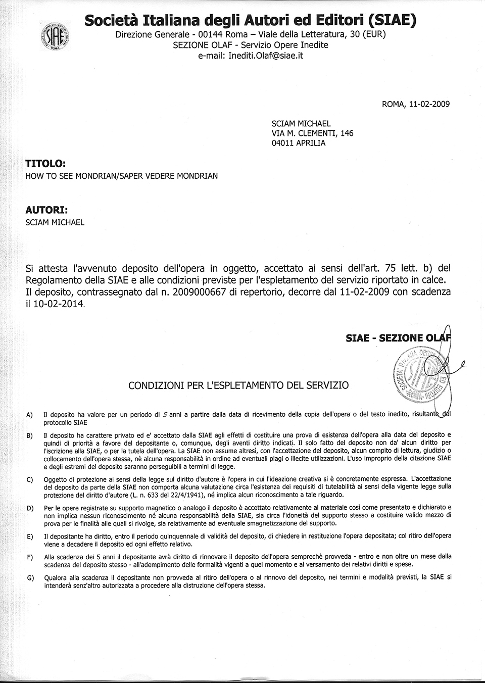 Below are the copyright registration certificates issued by the Library of Congress in Washington (dated respectively March1989 / Jully 2006 / July 2008) and the SIAE (Italian Society of Authors and Publishers) in Rome (dated respectively April 1991 / October 2005 / July 2006 / February 2009 / May 2009 /.