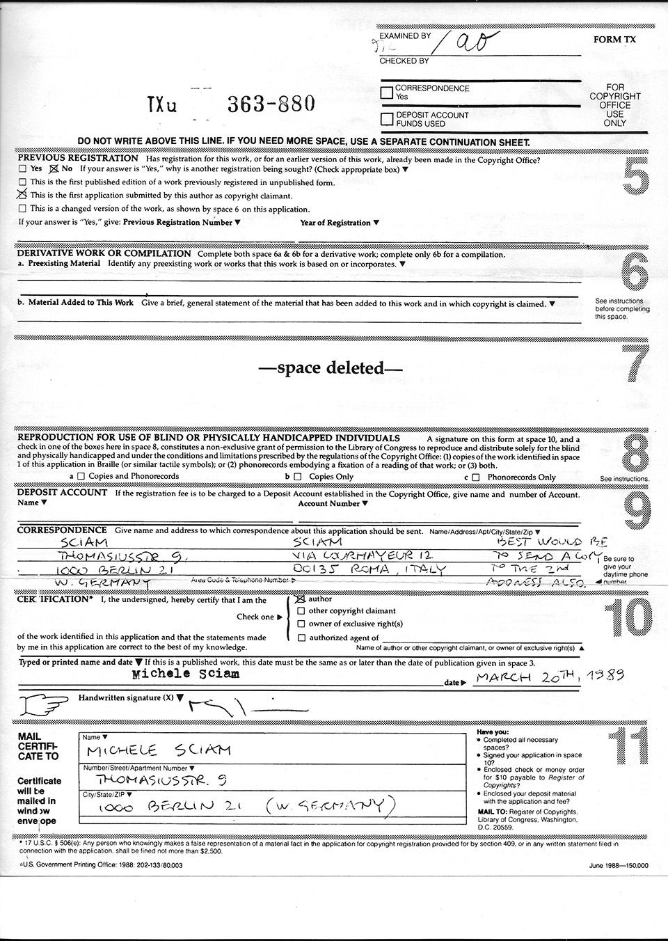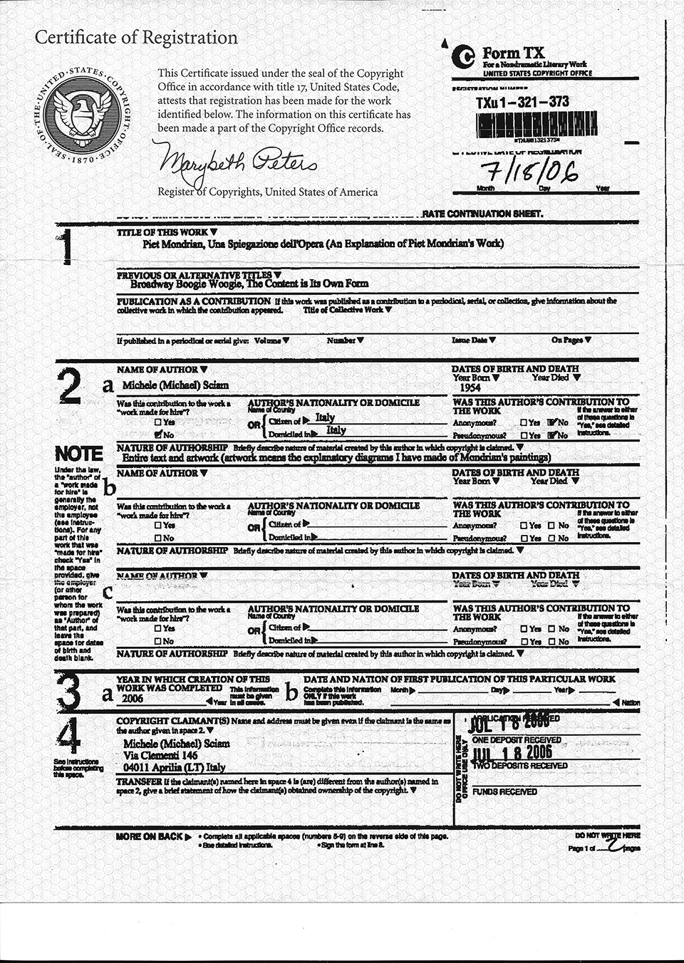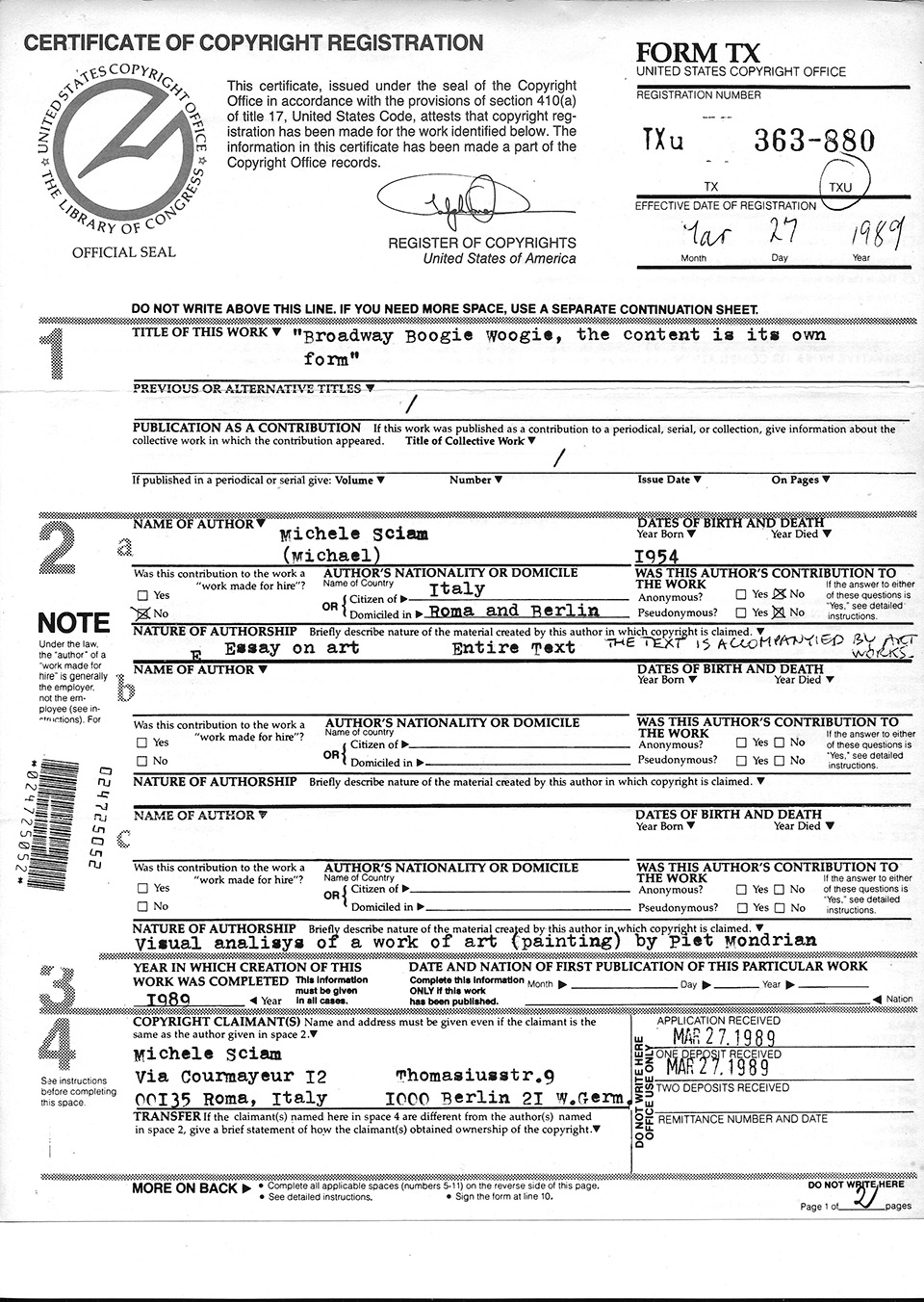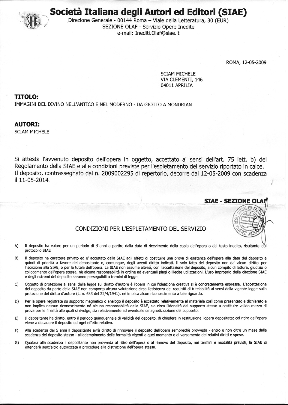 Below are the copyright registration certificates issued by the Library of Congress in Washington (dated respectively March1989 / Jully 2006 / July 2008) and the SIAE (Italian Society of Authors and Publishers) in Rome (dated respectively April 1991 / October 2005 / July 2006 / February 2009 / May 2009 /.